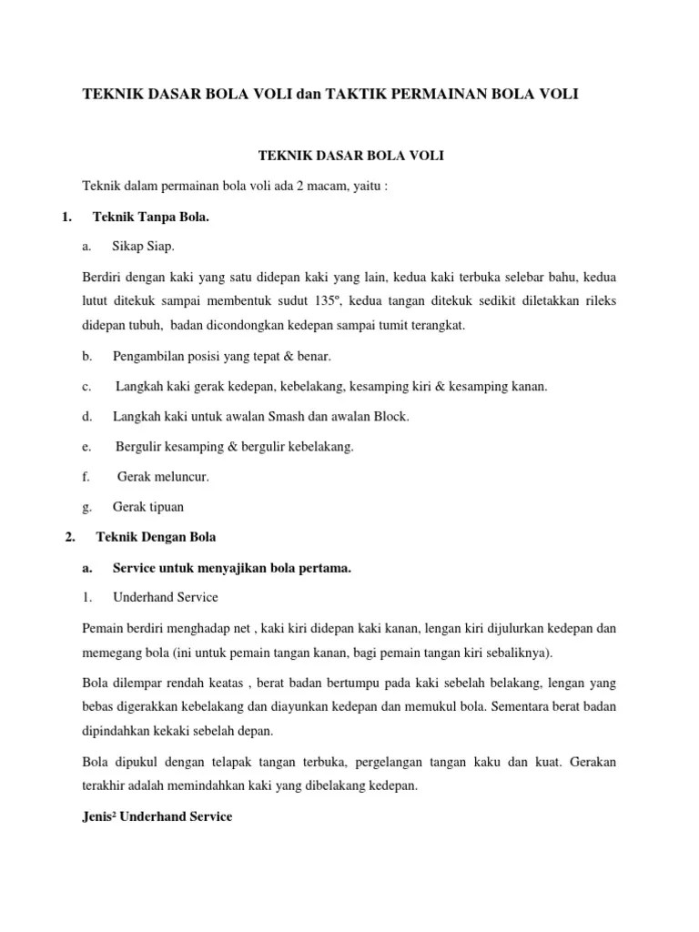 Bola ada dalam permainanbola voli sejak servis dilakukan. Di dalam permainan bola voli terdapat berbagai teknik dasar, mulai teknik servis hingga teknik smash. Apa saja teknik dasar permainan bola voli · teknik servis · teknik passing bawah · teknik passing atas · teknik smash · teknik menghadang (block). Jawaban · 1.teknik servis (service). Dribbling, passing, shooting, defense, dan rebound adalah teknik dasar permainan bola basket. Teknik dasar dalam permainan bola voli, ini penjelasannya · 1. Posisi 1 pada permainan bola voli yaitu server. Dalam dunia profesional bola voli, servis terbagi menjadi tiga jenis, yakni servis bawah (underhand), servis atas (overhand), dan servis . Sebutkan macam macam servis dalam permainan bola voli.